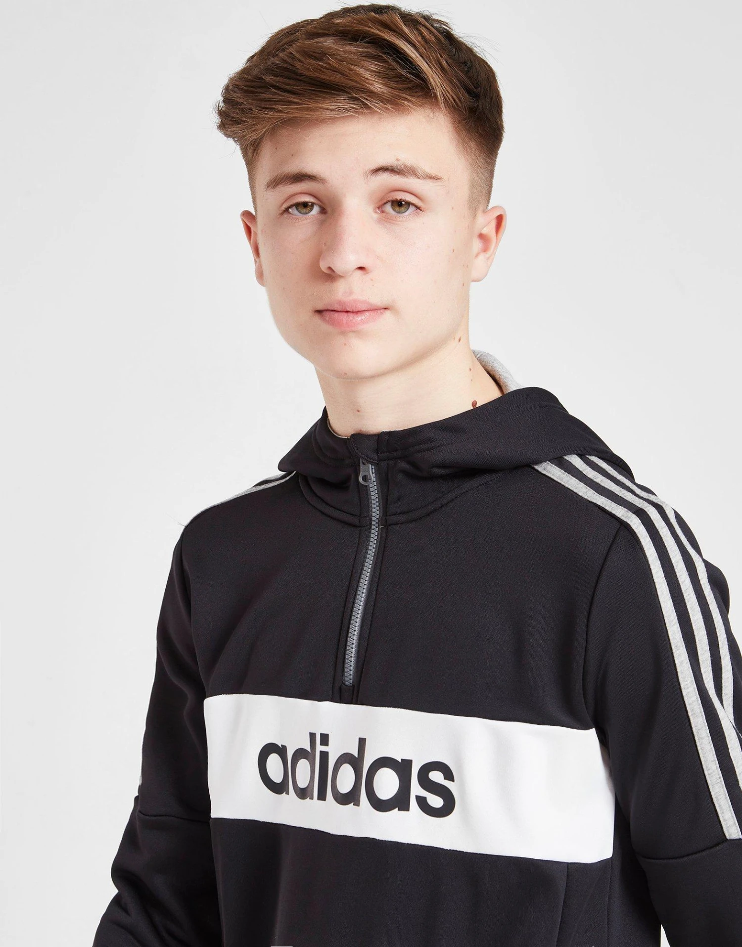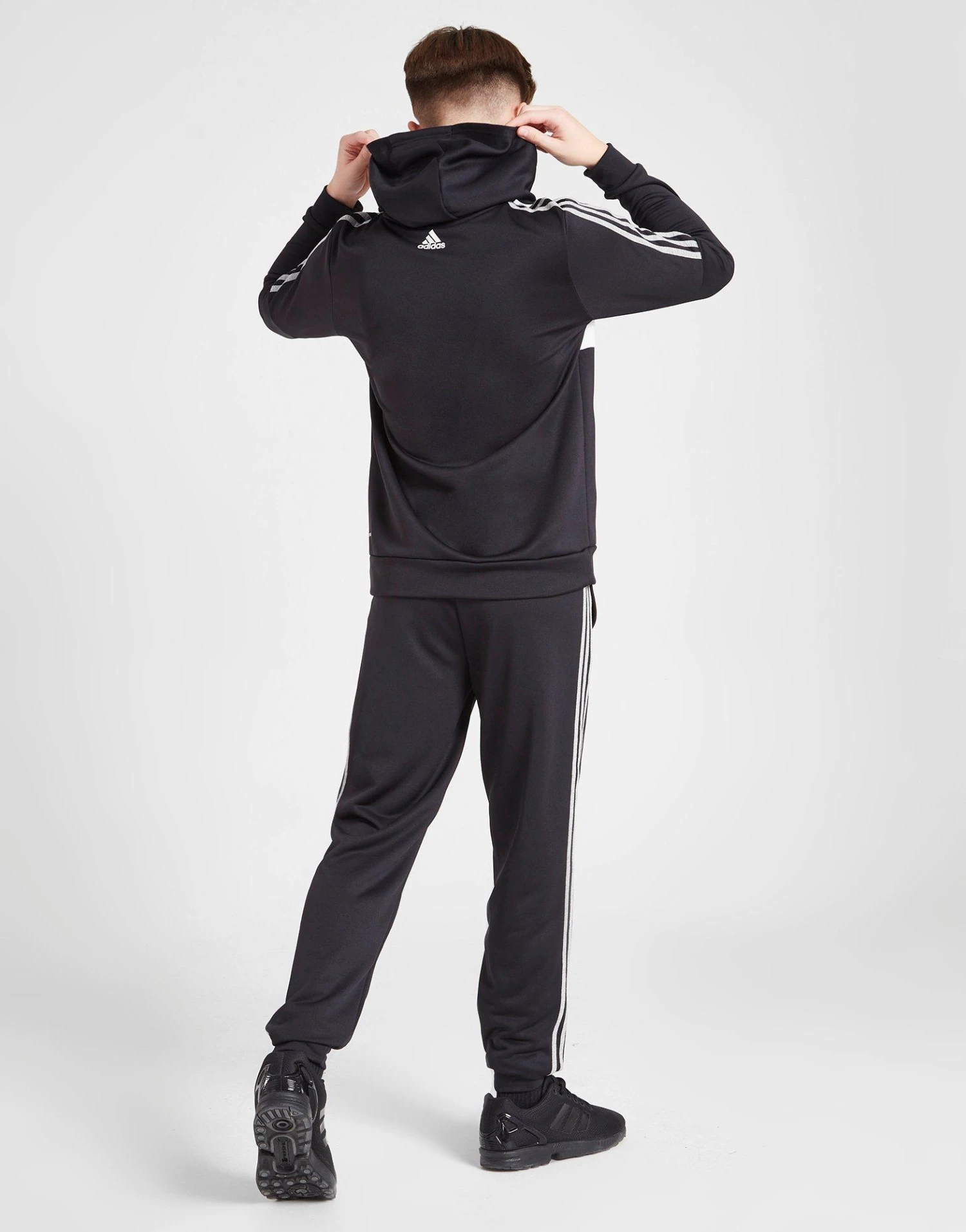 • Renouvelle ton style décontracté avec ce survêtement à capuche à panneau zippé pour juniors d’adidas, dans un coloris noir, cet ensemble est fabriqué à partir de tissu poly-polaire recyclé lisse pour un confort durable.