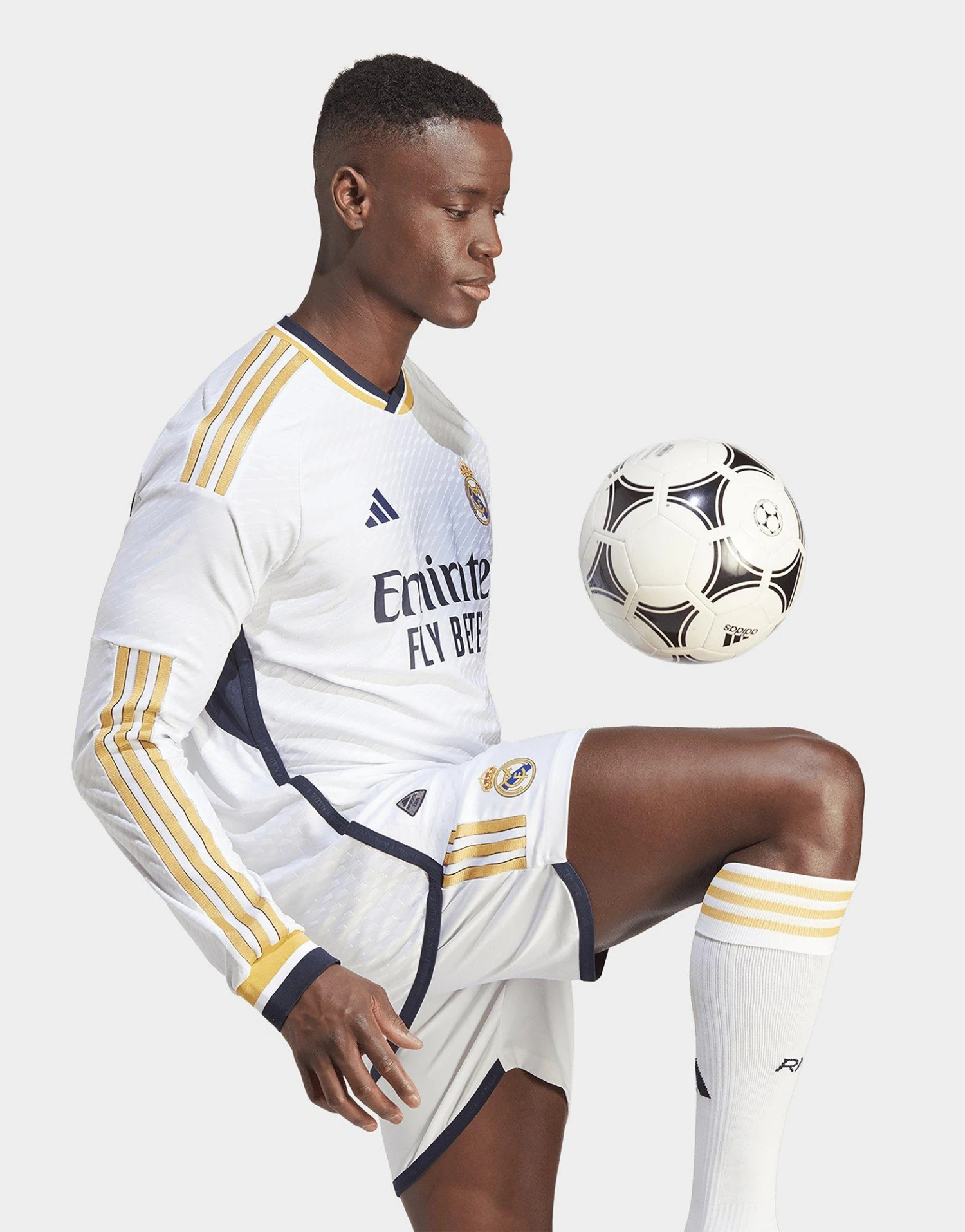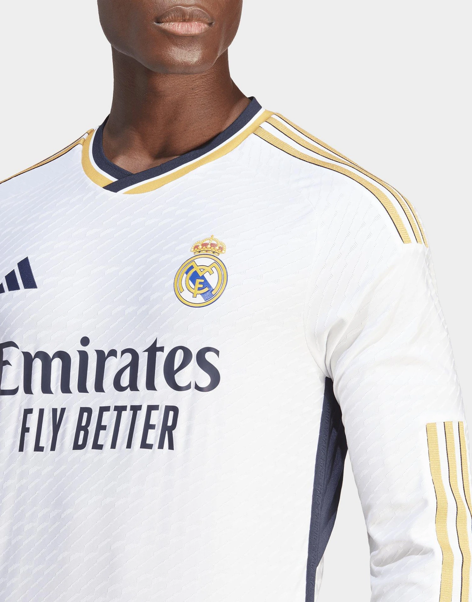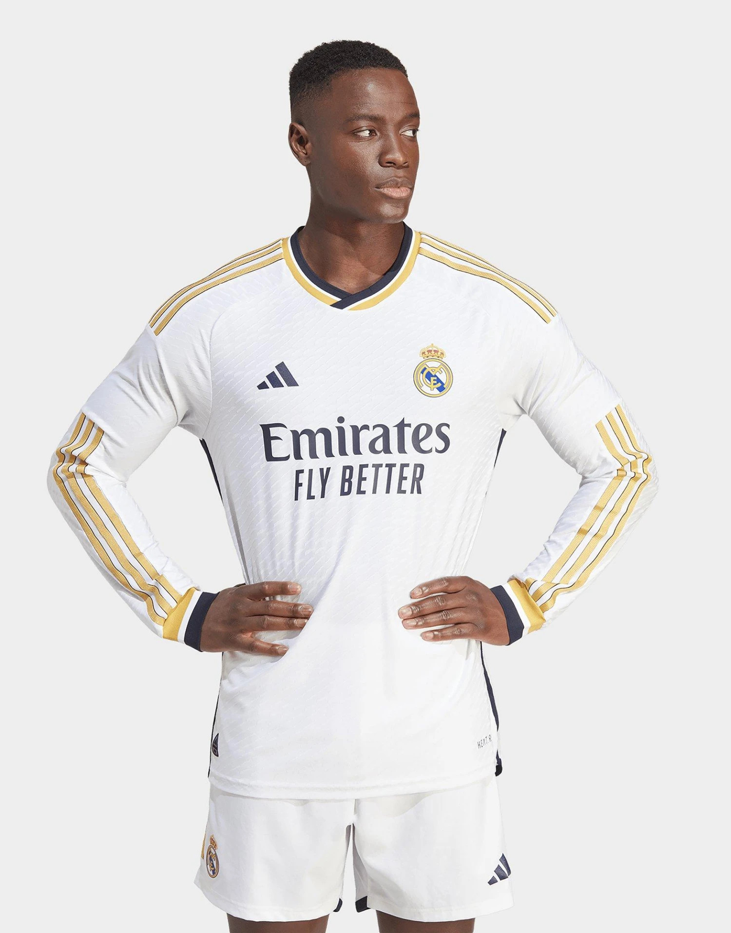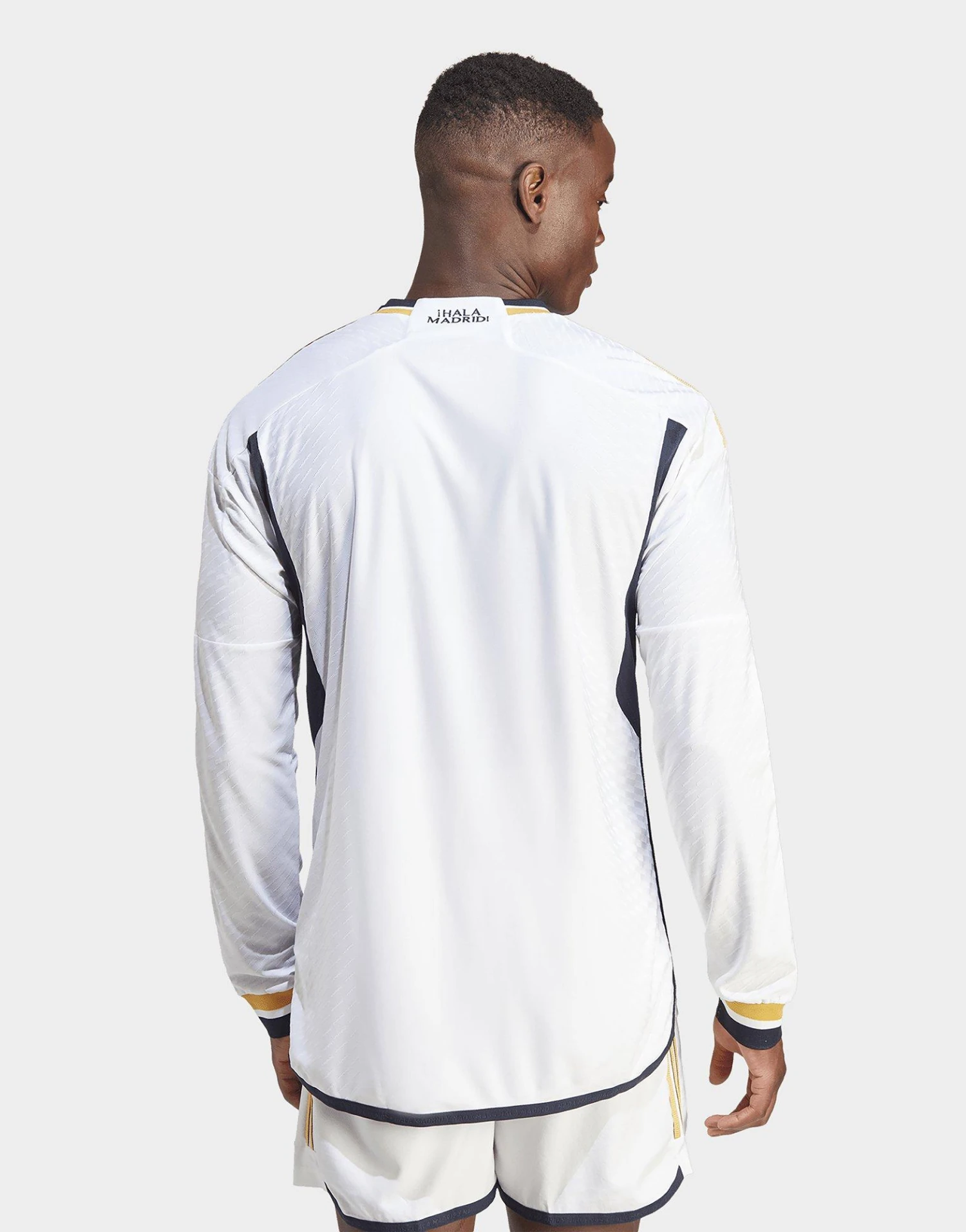 Le maillot manches longues domicile authentique du Real Madrid 23/24 revisite la tradition avec une touche dorée. Conservant une base blanc immaculé, ce maillot unique perpétue un héritage iconique, avec un design élégant et léger inspiré de l’histoire d’un club de football légendaire.En clin d’œil aux tenues plus anciennes, des détails dorés sont réintroduits avec une structure bleu marine. L’imprimé graphique intégral revisite la couleur blanche classique, avec une nouvelle silhouette football qui te permet d’afficher la classe et le style du club en dehors du terrain. La matière HEAT.RDY optimise la circulation de l’air pour te garder au frais, tandis que le blason brodé et l’inscription « ¡Hala Madrid! » sur le col représentent la soif de victoire de l’équipe.